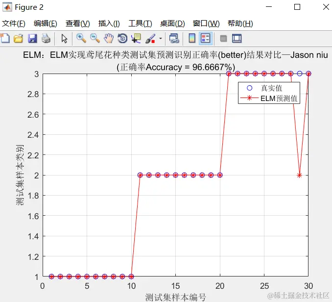string = {'ELM:ELM实现鸢尾花种类测试集预测识别正确率(better)结果对比—Jason niu';['(正确率Accuracy = ' num2str(Accuracy_2) '%)' ]};