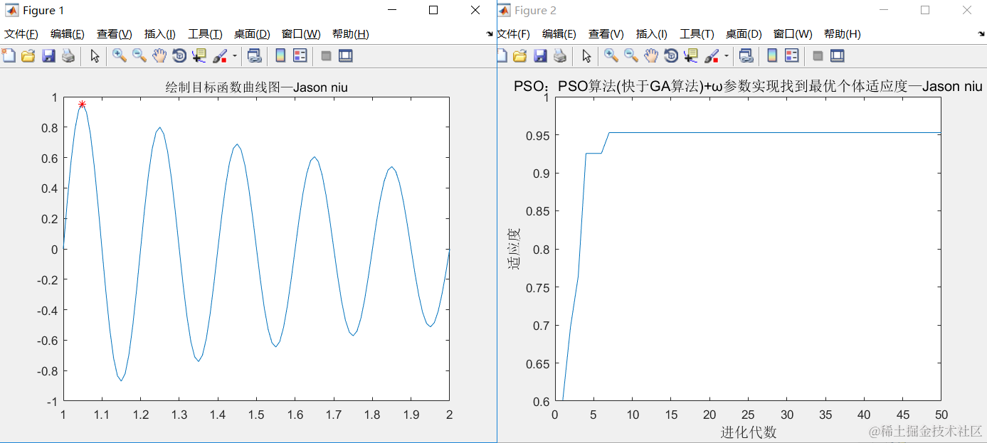title('PSO:PSO算法(快于GA算法)+ω参数实现找到最优个体适应度—Jason niu','fontsize',12);