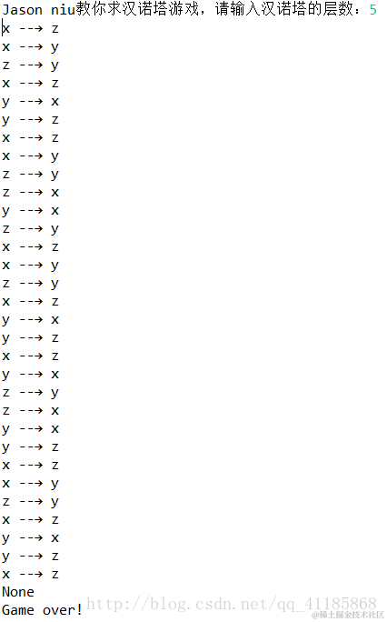 hanoi(n-1,y,x,z) #将y上的n-1个盘子移动到z上