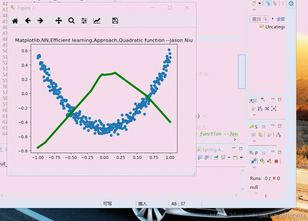 TF之NN:利用神经网络系统自动学习散点(二次函数+noise+优化修正)输出结果可视化(matplotlib动态演示)