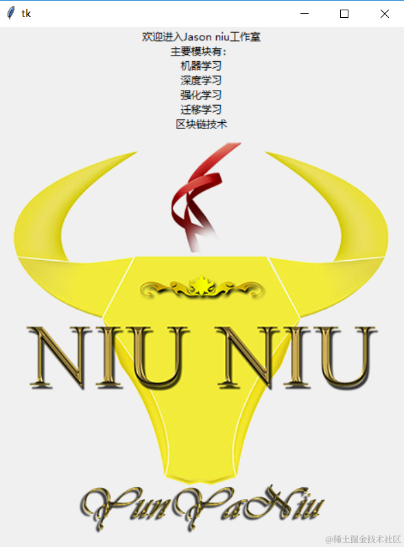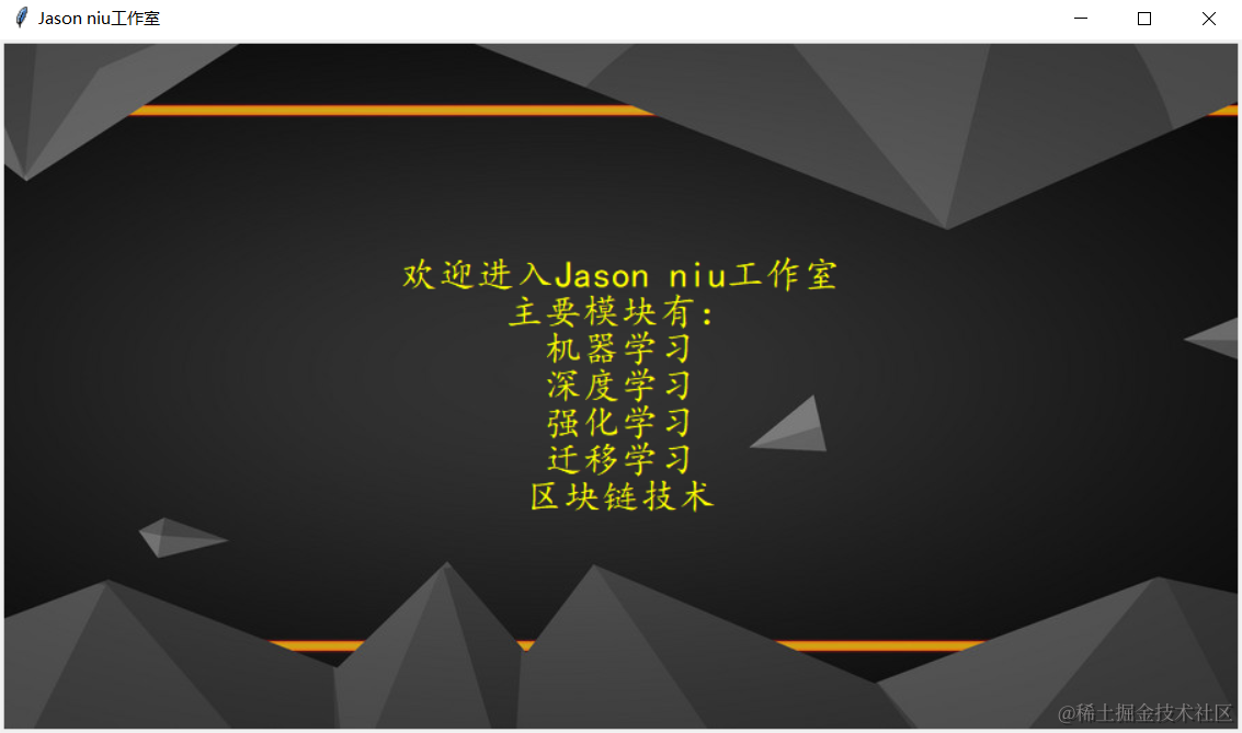 text="欢迎进入Jason niu工作室\n主要模块有:\n机器学习\n深度学习\n强化学习\n迁移学习\n区块链技术",