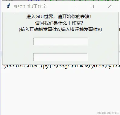 theLabel=tk.Label(master,text="进入GUI世界,请开始你的表演!\n请问我们是什么工作室?\n(输入正确触发事件A,输入错误触发事件B)")