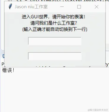 theLabel=tk.Label(master,text="进入GUI世界,请开始你的表演!\n请问我们是什么工作室?\n(输入正确才能自动切换到下一行)")