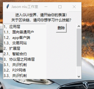 theLabel=tk.Label(master,text="进入GUI世界,请开始你的表演!\n关于区块链架构设计,请问你想学习什么技能?")