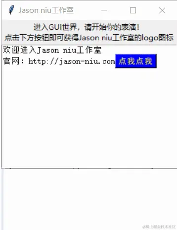 theLabel=tk.Label(root,text="进入GUI世界,请开始你的表演!\n点击下方按钮即可获得Jason niu工作室的logo图标")