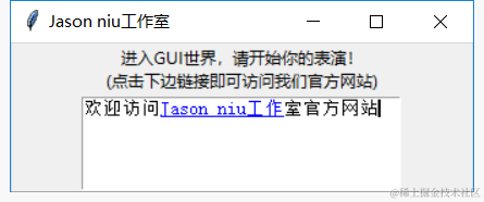 theLabel=tk.Label(root,text="进入GUI世界,请开始你的表演!\n(点击下边链接即可访问我们官方网站)")