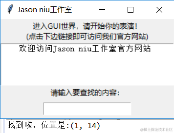 theLabel=tk.Label(root,text="进入GUI世界,请开始你的表演!\n(点击下边链接即可访问我们官方网站)")