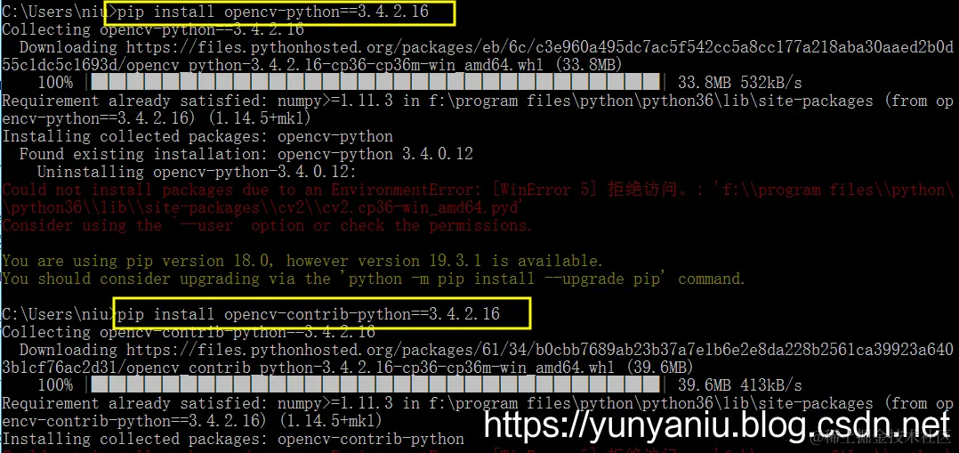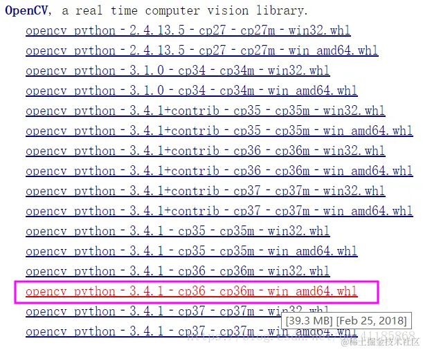 先去官网www.lfd.uci.edu/~gohlke/pyt…,下载相应Python版本的OpenCV的whl文件,如本人下载的opencv_python‑3.4.1‑cp36‑cp36m‑win_amd64.whl,然后在whl文件所在目录下,命令 进行安装即可