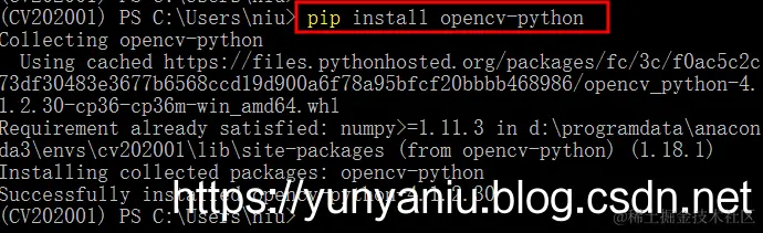 pip install opencv-python //Anaconda 环境下安装,先打开Anaconda Prompt,再输入本命令进行安装!