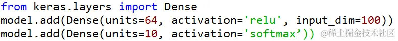 model = Sequential([ Dense(32, units=784), Activation('relu'), Dense(10), Activation('softmax'), ])