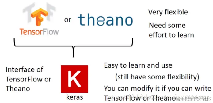 TensorFlow和theano以及Keras都是深度学习框架,TensorFlow和theano比较灵活,也比较难学,它们其实就是一个微分器 Keras其实就是TensorFlow和Keras的接口(Keras作为前端,TensorFlow或theano作为后端),它也很灵活,且比较容易学。可以把keras看作为tensorflow封装后的一个API。Keras 是一个用于快速构建深度学习原型的高级库。我们在实践中发现,它是数据科学家应用深度学习的好帮手。Keras 目前支持两种后端框架:TensorFlow 与 Theano,而且 Keras 再过不久就会成为 TensorFlow 的默认 API。