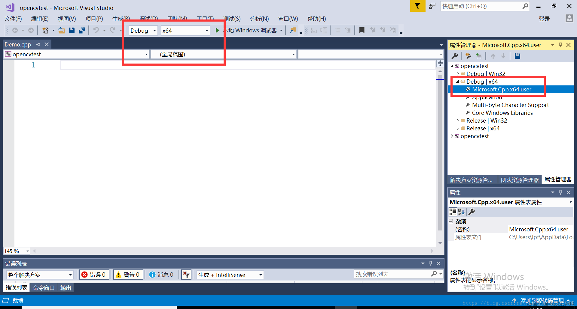在新出现的“属性管理器”工作区中,展开【Debug|Win64】文件夹,对文件夹中的【Microsoft.cpp.x64.user】进行右键属性操作,或者双击,就可打开工程最通用的属性页面。注意:别人的教程是Win32的 ,所以展开的【Debug|Win32】,我照着别人的步骤进行,最后编译程序时一直报错,错误原因是“与目标计算机冲突”,而我的电脑是x64的,这是一个坑,请不要踩。