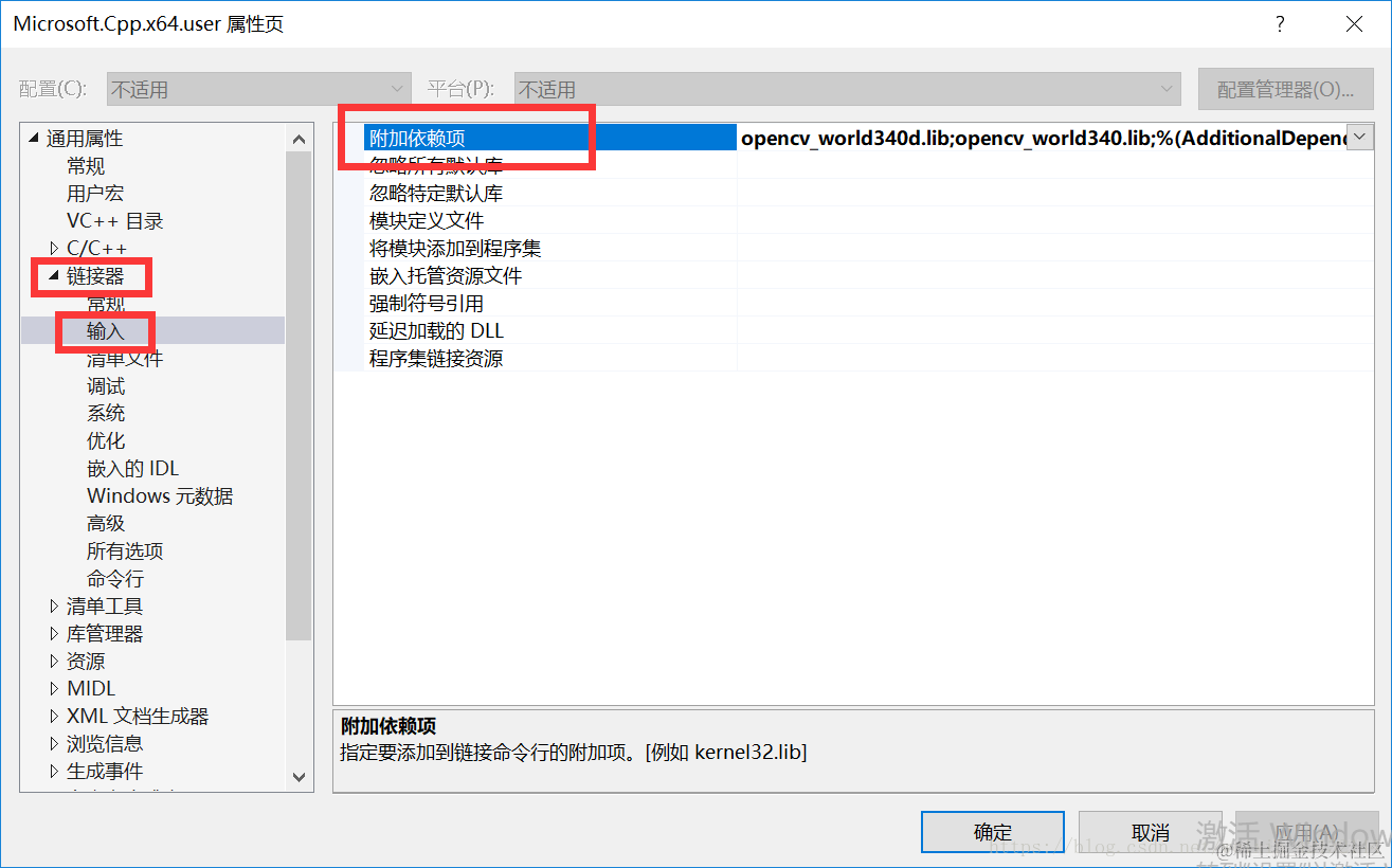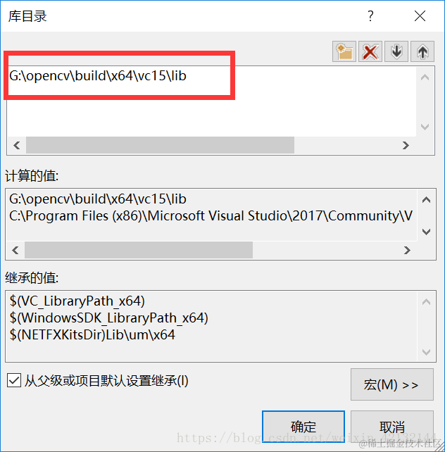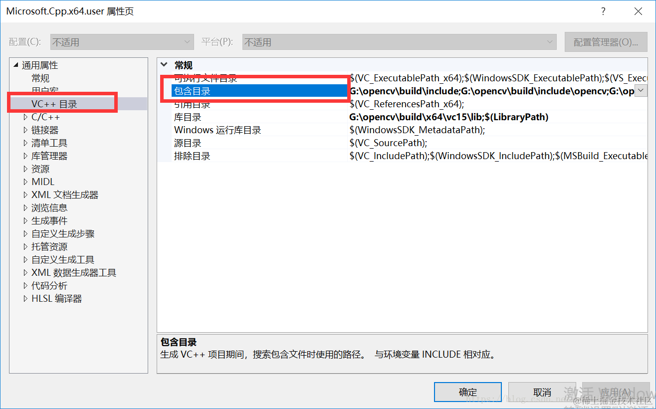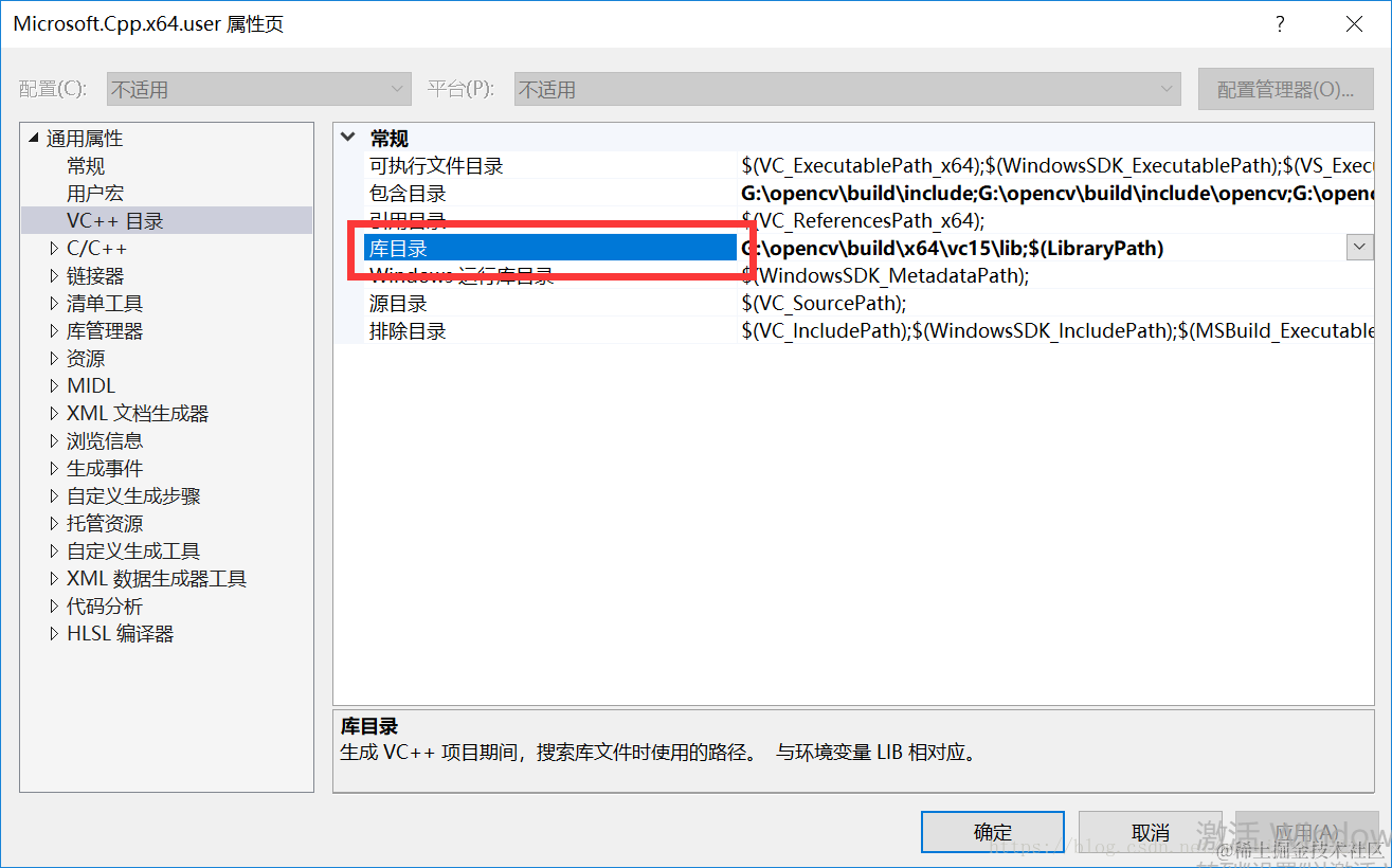 还是在【VC++目录】下,在【库目录】中添加 G:\opencv\build\x64\vc15\lib 这个路径,如下图所示。