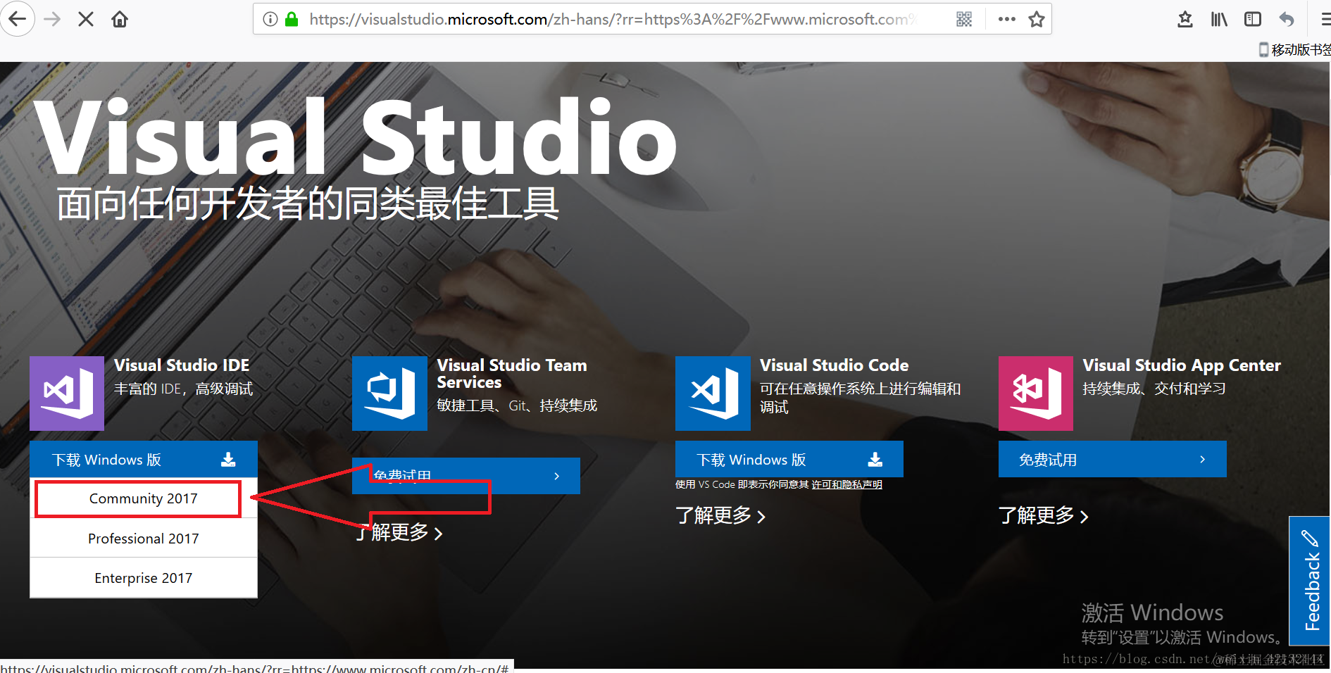 Visual studio2017是是美国微软公司的开发工具包系列产品,请点击链接进入Visual studio官网,页面如下图所示,按照图中表格所示进行操作。