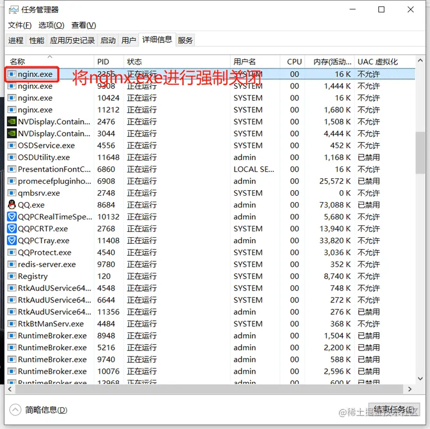 如上图所示,读写权限都是有的,但是却没有生成hls流。我们在关闭Nginx服务后发现nginx.exe这个服务并没有停止,所以使用任务管理器将nginx.exe进行强制关闭,如下图: