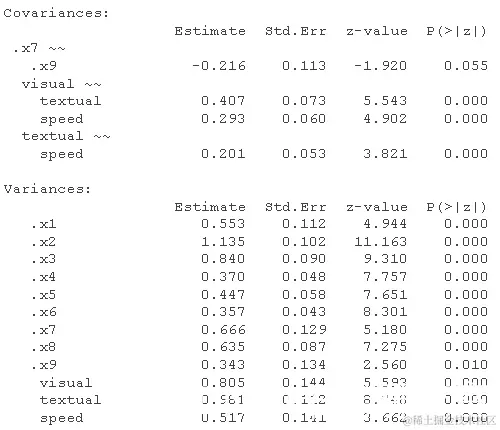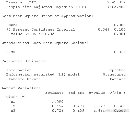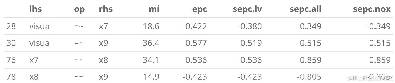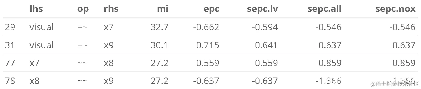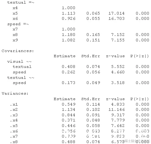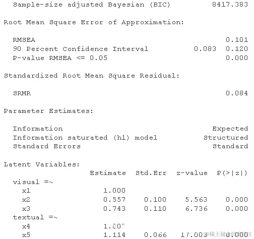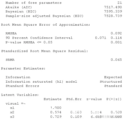 修正指数表明 x9 可能会加载 visual 因子,或者 x7 可能 x9 具有唯一的残差相关性。这又是一个理论上的问题,但我们可以测试修改后的模型以进行演示。我们使用 ~~ 运算符来指定模型中的(残差)方差或协方差项。