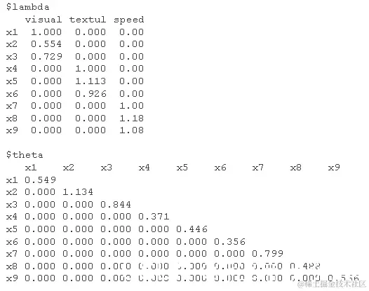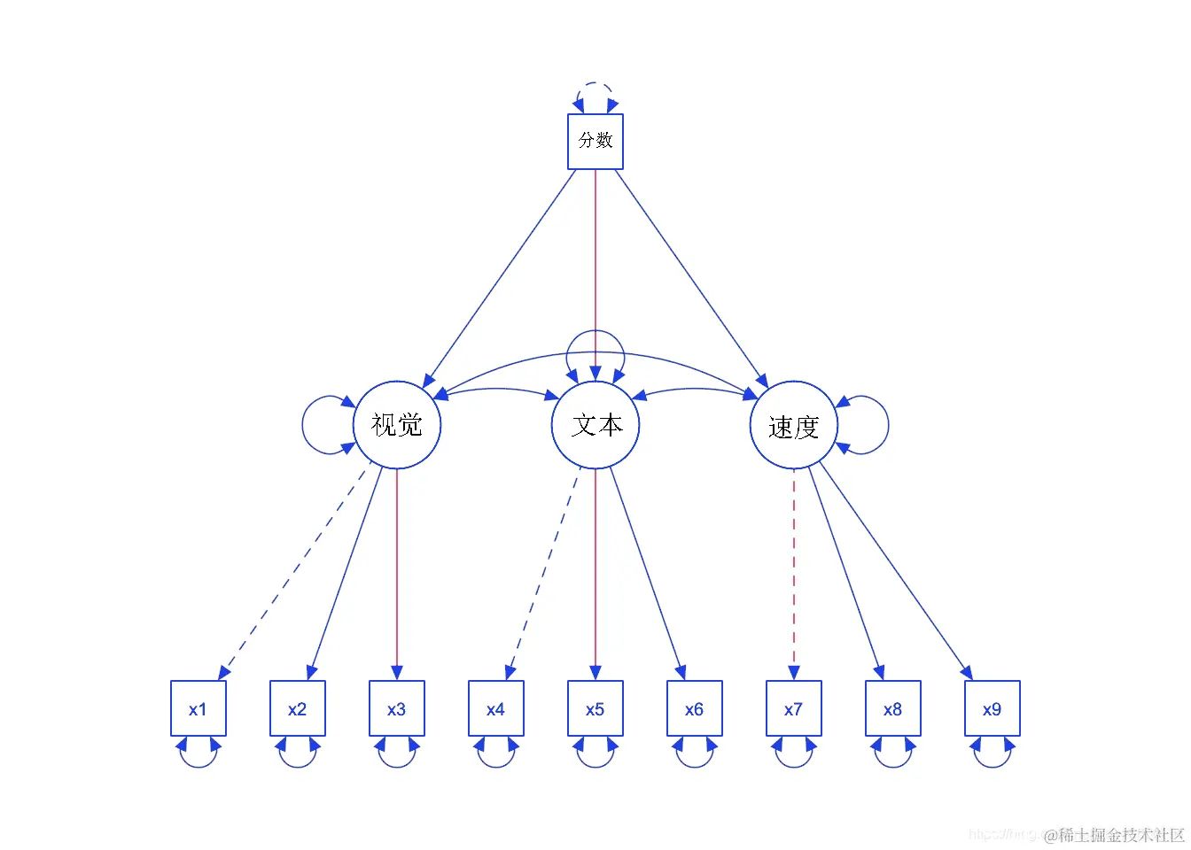 让我们以 衡量智力为例,其中有 9 个项目可以衡量智力的不同方面:视觉、文本和速度。观察到的变量是 x1-x9。