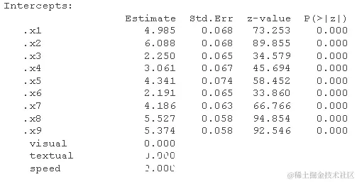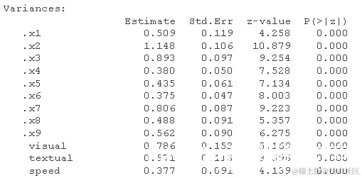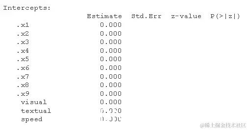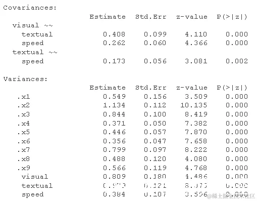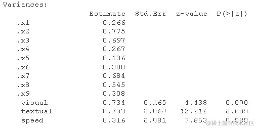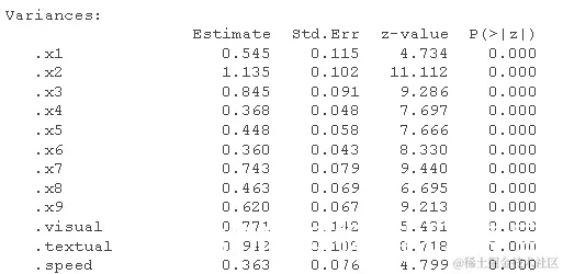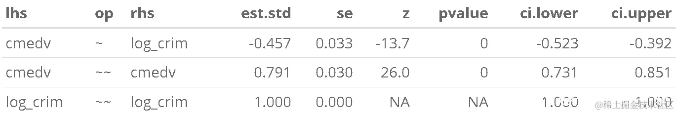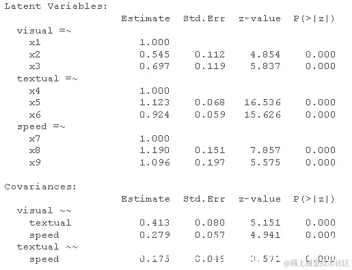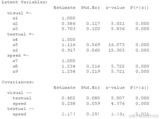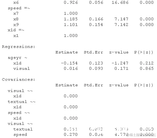 请注意,我们也可以得到标准化的估计值 。这是 SEM 中更复杂的主题,因为我们可以仅针对潜在变量(std.lv)或观察变量和潜在变量(std.all)进行标准化。后者通常是 SEM 论文中作为标准化估计报告的内容。