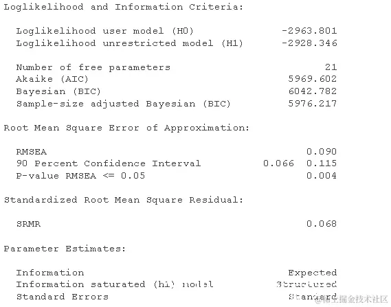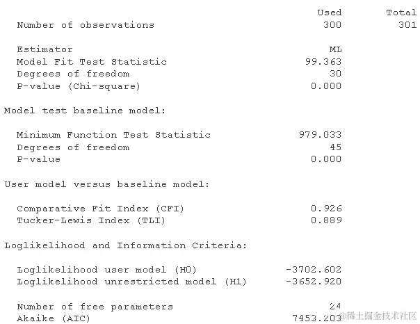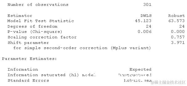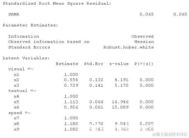 最后, 可以用许多不同的算法来估计模型中的参数。“ML”是连续数据的默认值,“WLS”是(部分)分类数据的默认值。
