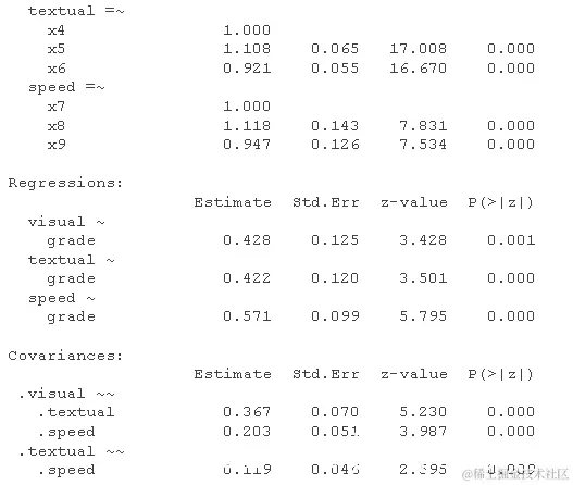 上面的 CFA 只包含一个测量模型——一个具有因子之间相关性的三因子模型。如果我们还想看看学校的年级在多大程度上可以预测智力因素(视觉、文本、速度)的水平,该怎么办?