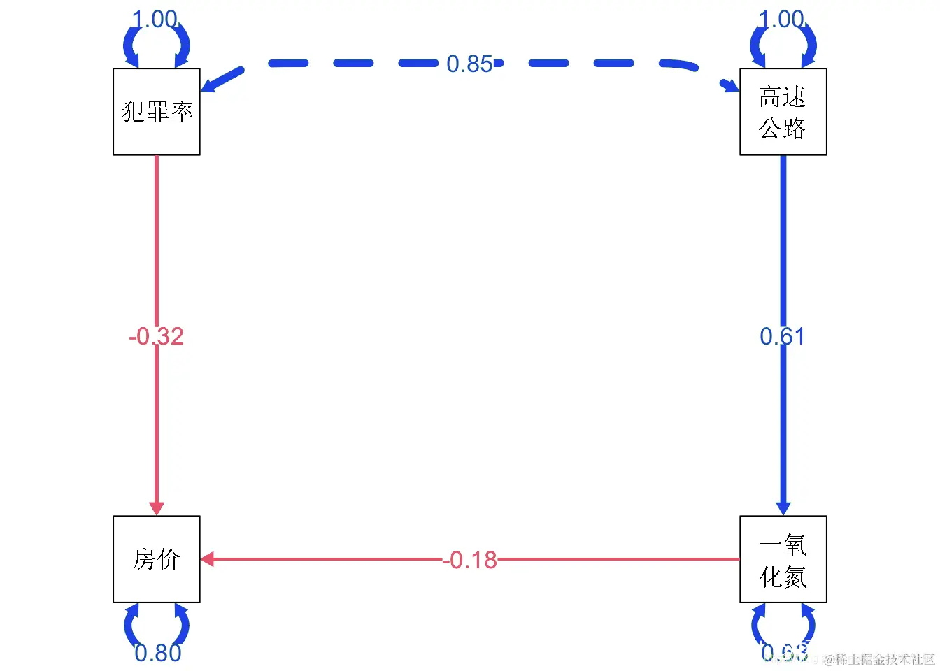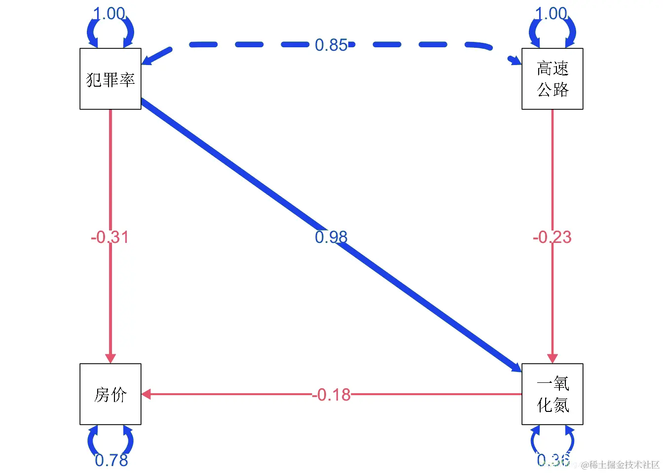这在拟合方面看起来好多了。 犯罪与我们之前错过的氮氧化物水平之间存在强烈的正相关关系。从概念上讲,这表明犯罪与房价之间的关系部分是由犯罪对污染物水平的影响所调节的。相比之下,靠近高速公路对房价的影响似乎完全由污染物水平调节(正如这条路径没有大的修正指数所示)。