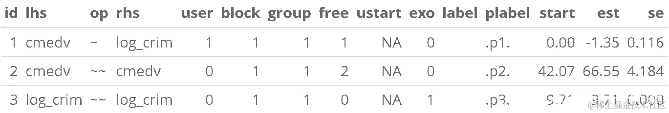 "参数 "表提供了模型中哪些参数是必须被估计,以及用户在模型语法中要求哪些参数的重要摘要。