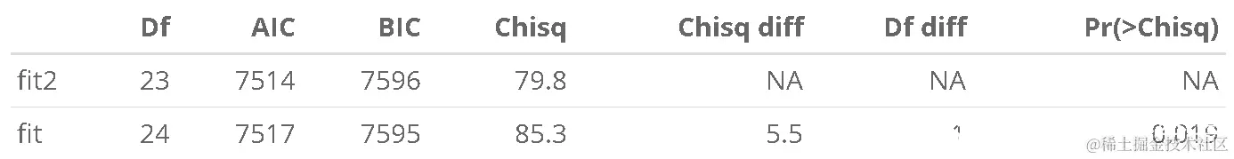 该 anova 函数将使用 LRT 方法测试整体拟合差异。LRT 的自由度是自由参数数量的差异(此处为 1)。