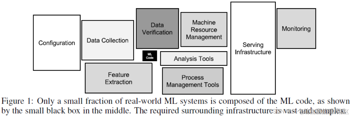 Figure 1: Only a small fraction of real-world ML systems is composed of the ML code, as shown by the small black box in the middle. The required surrounding infrastructure is vast and complex.图1:只有一小部分真实世界的ML系统由ML代码组成,如中间的小黑盒子所示。所需的周边基础设施庞大而复杂。 | |