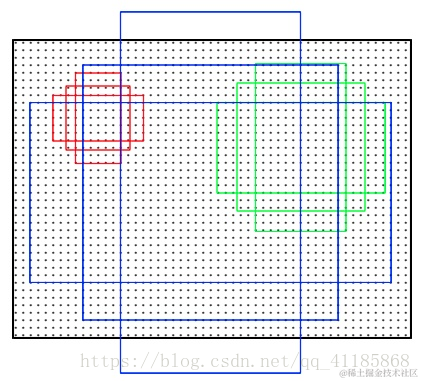 对于每个3x3窗口,作者假定它来自9种不同原始区域的池化,但是这些池化在原始图片中的中心点,都完全一样。这个中心点,就是刚才提到的,3x3窗口中心点所对应的原始图片中的中心点。如此一来,在每个窗口位置,我们都可以根据9个不同长宽比例、不同面积的anchor,逆向推导出它所对应的原始图片中的一个区域,这个区域的尺寸以及坐标,都是已知的。而这个区域,就是我们想要的 proposal。