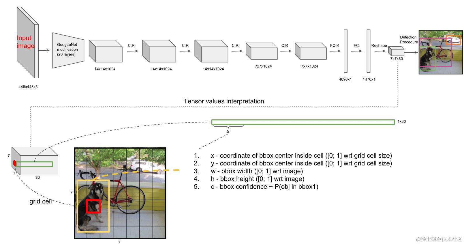- YOLO将全图划分为S×S的格子,每个格子负责对落入其中的目标进行检测,一次性预测所有格子所含目标的边界框、定位置信度、以及所有类别概率向量。