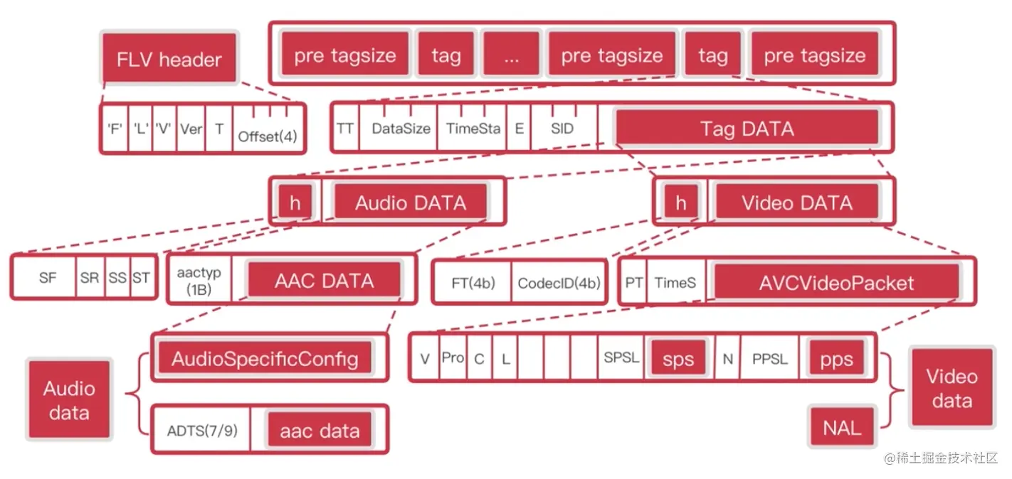 Tag header : 类型(音频、视频) + 数据大小 + 时间戳 + 时间戳扩展位 + streamid