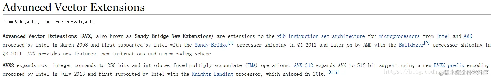 Advanced Vector Extensions (AVX, also known as Sandy Bridge New Extensions) 先进的矢量扩展(AVX,也称为桑迪桥新的扩展)是从英特尔和英特尔在2008年3月提出的微处理器的X86指令集架构的扩展,第一次由英特尔支持,在第2011季度和以后的SoeBoE桥处理器装运。AMD与推土机处理器航运在Q3 2011。AVX提供了新的特性、新的指令和新的编码方案。AVX2将大多数整数命令扩展为256位,并介绍了融合乘法累加(FMA)操作。AVX-512扩展AVX到512位支持使用一个新的EVEX前缀编码由英特尔提出的2013年7月,第一次支持英特尔与骑士着陆处理器,在2016装运。