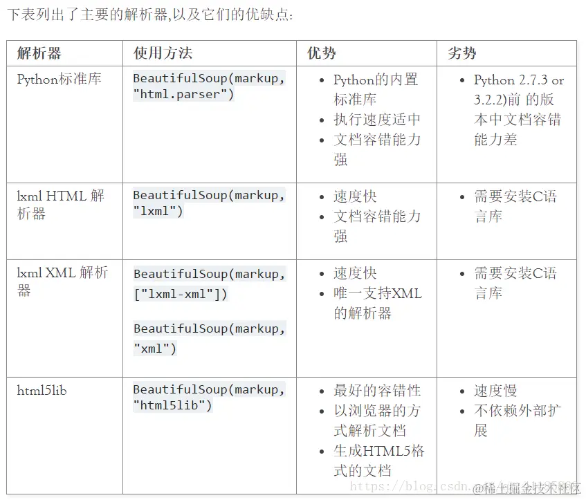 然后,Beautiful Soup选择最合适的解析器来解析这段文档,如果手动指定解析器那么Beautiful Soup会选择指定的解析器来解析文档.(参考 解析成XML ).