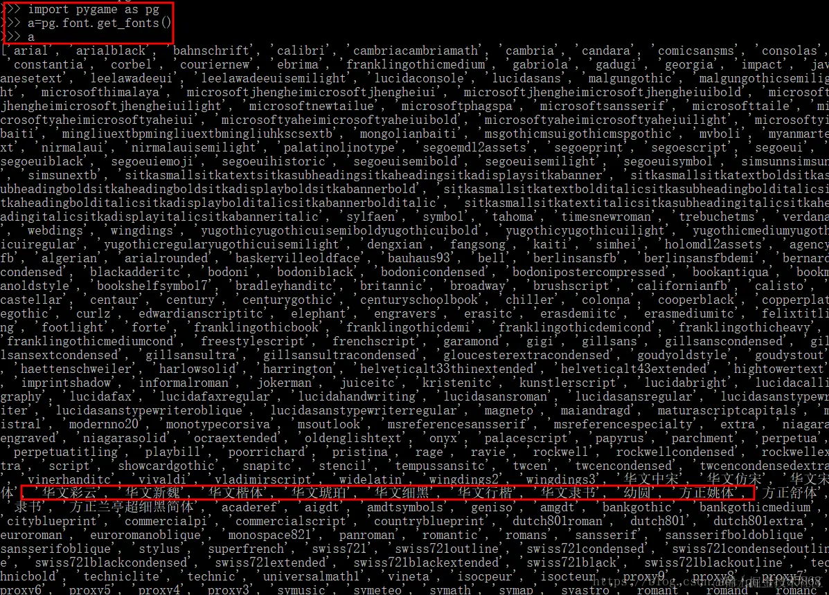 >>> a=pg.font.get_fonts() #查询当前电脑的所有字体格式
