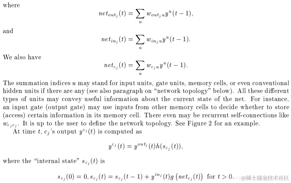 | Memory cells and gate units. To construct an architecture that allows for constant error ow through special, self-connected units without the disadvantages of the naive approach, we extend the constant error carrousel CEC embodied by the self-connected, linear unit j from Section 3.2 by introducing additional features. A multiplicative input gate unit is introduced to protect the memory contents stored in j from perturbation by irrelevant inputs. Likewise, a multiplicative output gate unit is introduced which protects other units from perturbation by currently irrelevant memory contents stored in j. | 记忆单元和门单元。为了构建一个允许通过特殊的、自连接的单元实现恒定误差的体系结构,同时又不存在朴素方法的缺点,我们通过引入额外的特性来扩展3.2节中自连接的线性单元j所包含的恒定误差carrousel CEC。为了保护存储在j中的存储内容不受无关输入的干扰,引入了乘法输入门单元。同样地,一个乘法输出门单元被引入,它保护其他单元不受当前不相关的存储在j中的内存内容的干扰。 |