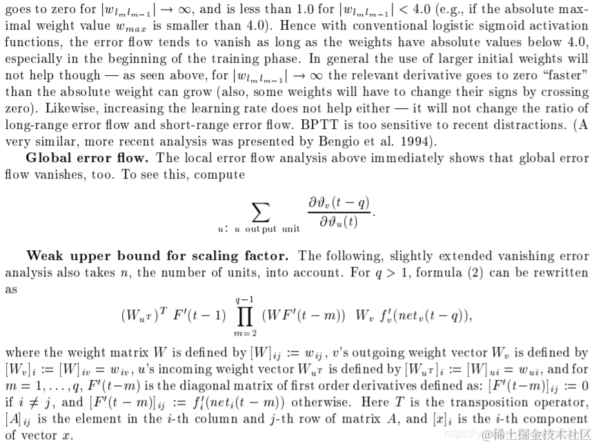 | The corresponding contribution to wjl 's total weight update is #j (t)yl (t 1), where is the learning rate, and l stands for an arbitrary unit connected to unit j. Outline of Hochreiter's analysis (1991, page 19-21). Suppose we have a fully connected net whose non-input unit indices range from 1 to n. Let us focus on local error ow from unit u to unit v (later we will see that the analysis immediately extends to global error ow). The error occurring at an arbitrary unit u at time step t is propagated \back into time" for q time steps, to an arbitrary unit v. This will scale the error by the following fact | wjl的总权重更新的相应贡献是#j (t)yl (t 1),其中为学习率,l表示连接到j单元的任意单元。Hochreiter分析概要(1991年,第19-21页)。假设我们有一个完全连通的网络,它的非输入单位指数范围从1到n。让我们关注从单位u到单位v的局部误差ow(稍后我们将看到分析立即扩展到全局误差ow)。发生在任意单位u上的时间步长t的误差被传播回时间中,对于q时间步长,传播回任意单位v |