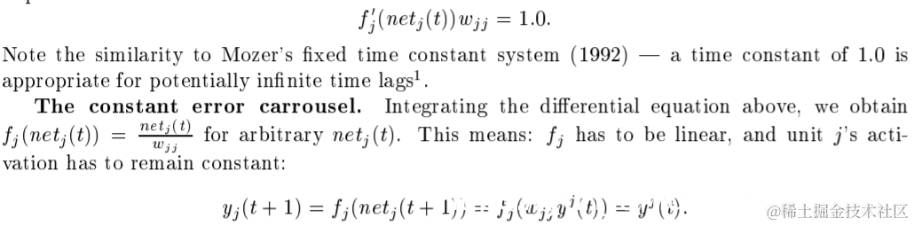 | In the experiments, this will be ensured by using the identity function fj : fj (x) = x; 8x, and by setting wjj = 1:0. We refer to this as the constant error carrousel (CEC). CEC will be LSTM's central feature (see Section 4). Of course unit j will not only be connected to itself but also to other units. This invokes two obvious, related problems (also inherent in all other gradient-based approaches): | 在实验中,利用恒等函数fj: fj (x) = x来保证;设置wjj = 1:0。我们称之为常误差卡鲁塞尔(CEC)。CEC将是LSTM的中心特性(参见第4节)。当然,单元j不仅与自身相连,还与其他单元相连。这引发了两个明显的、相关的问题(也是所有其他基于梯度的方法所固有的): |