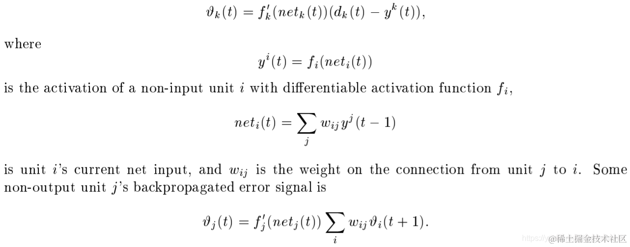 | Conventional BPTT (e.g. Williams and Zipser 1992). Output unit k's target at time t is denoted by dk (t). Using mean squared error, k's error signal is | 传统的BPTT(如Williams和Zipser 1992)。输出单元k在t时刻的目标用dk (t)表示,利用均方误差,k的误差信号为 |