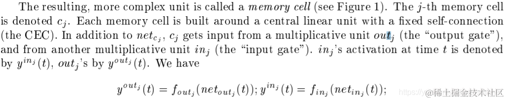 | 图1:memory cel l cj(盒子)的结构和它的门单元inj;outj。自循环连接(权值为1.0)表示反馈延迟1个时间步长。它建立了恒定误差carrousel“CEC”的基础。星门单元打开和关闭CEC的入口。详情见正文和附录A.1。 | |