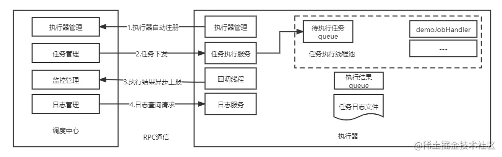 从架构图可以看出,分别有调度中心和执行器两大组成部分。