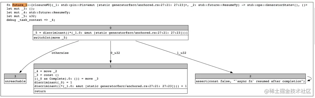 我们可以透过 MIR[5]来看一下前面提到的 generator 是什么样子的。MIR 是 Rust 的一个中间表示,基于控制流图 CFG[6]表示。CFG 能够比较直观地展示程序执行起来大概是什么样子,MIR 在有时不清楚你的 Rust 代码到底变成了什么样子的时候能够起到一些帮助。