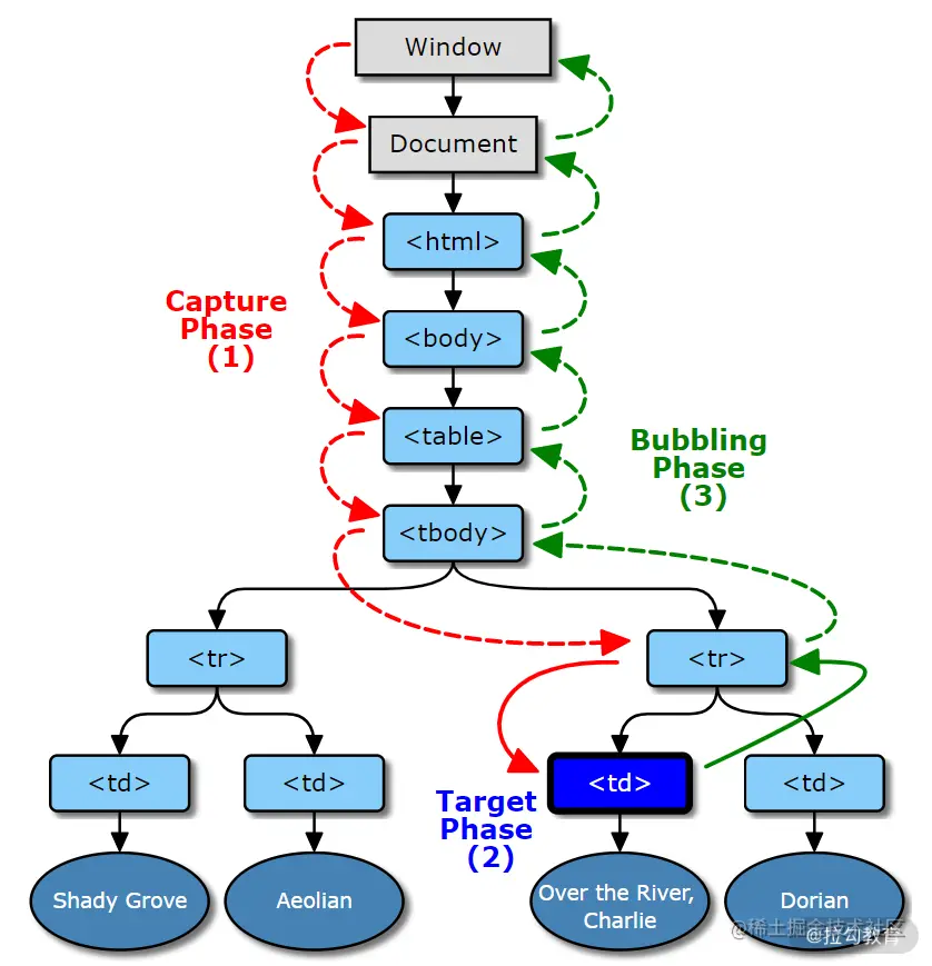 - 冒泡,事件对象从目标的父节点开始传播到 Window,图 1 的绿色过程。
