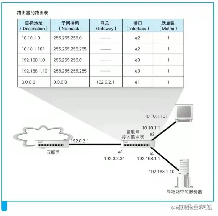 怎么区分网络号呢?一般将真实的IP地址和其对应的子网掩码进行与运算,得到的就是这个IP地址网络号的部分,剩下的就是主机号的部分。交换机在匹配网络包时,是将网络包的MAC地址和MAC地址表进行完全匹配,而路由器在匹配网络包时,是读取出网络包中的IP地址,首先将它和路由表每一行的子网掩码进行与运算,如果得到的网络号和前面的目标地址匹配,才会选择这一行后面对应的端口作为转发的输出端口。