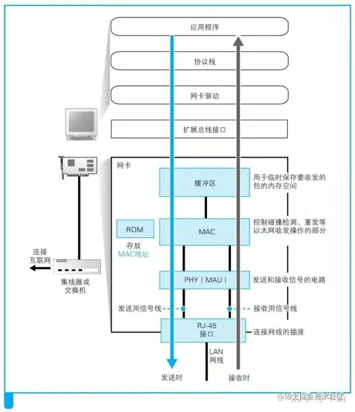 在发送数据时,网卡不能像交换机一样单独工作,它需要配合网卡驱动程序。在打开计算机启动操作系统的时候,网卡驱动程序会对硬件进行包括错误检查、初始化设置、从ROM中读取MAC地址分配给MAC模块等初始化操作。之后等待IP模块的委托,网卡驱动从IP模块(针对路由器就是转发模块)获取包之后,会将其复制到网卡内的缓冲区,然后委托MAC模块发送包。之后的过程就和交换机相同了,MAC模块添加报头等信息再转交给PHY模块发送出去。