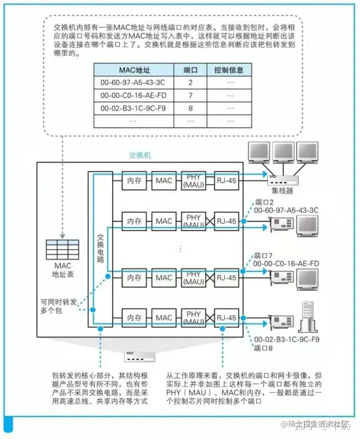 据上图可以看出,交换机的内部基本由RJ-45、PHY、MAC模块、内存、交换电路、MAC地址表六部分构成。相比于集线器,其中RJ-45、PHY部分完全相同。中继电路换成了交换电路,同时也多出了内存模块、MAC模块、MAC地址表。