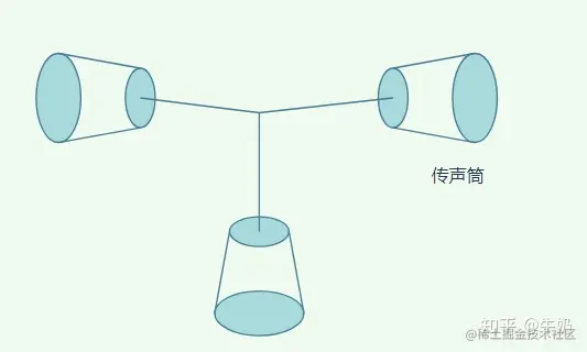 但是上述的传话方式只能在两者之间传输,为了能够让更多的人可以听到,后来的通信方式设计成类似这样: