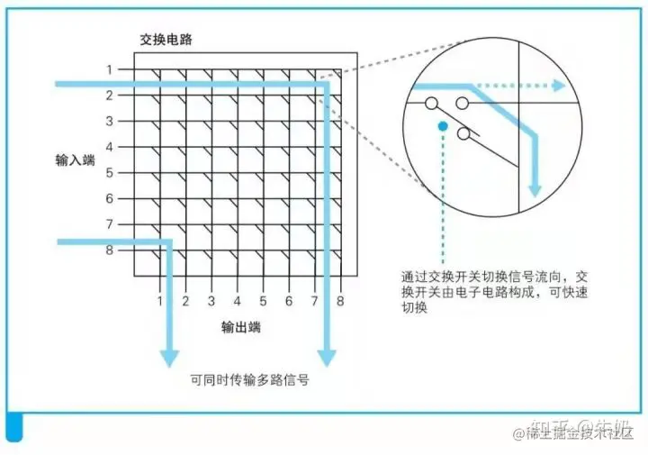 它将每个端口都作为输入和输出端,并构成网格形式连接起来,每个输入输出端口线的交点处安置一个可以电子控制的交换开关,这样精确的控制信号的流向。合理控制交换开关,不仅可以使得1号端口的信号流向某一端口,还可以使得1号端口的信号流向所有端口,更牛逼的是还可以1到7,2到6,3到5等多个端口同时转发,最大效率利用端口。 这样的设计,相比于之前集线器只能将信号发往所有端口的性质,可以说是实现了质的突破!