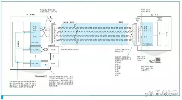 在集线器中,基本就分为三部分,RJ-45接口,PHY模块,中继电路。其中RJ-45接口就是我们日常常见的网卡的水晶头接口,RJ-45接口和PHY模块通过不同的接线方式配合,使得RJ-45接口有的用来和计算机相连,有的用来和另一个集线器相连。其中RJ-45的作用就是用来连接网线,而PHY模块的作用是将网线上传过来的不同格式的电信号转换为通用的格式发给中继电路,或者将要发送的电信号转换为可在网线上传输的格式。