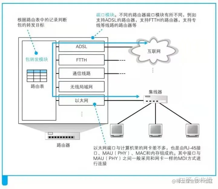 在之前,计算机所发出的网络包,都是先经过集线器和交换机进行区域性汇总,然后再转发给路由器一步步连接到互联网的。所以路由器距离互联网更近。这首先是两者宏观的一个小区别,我们接下来详细看看路由器结构: