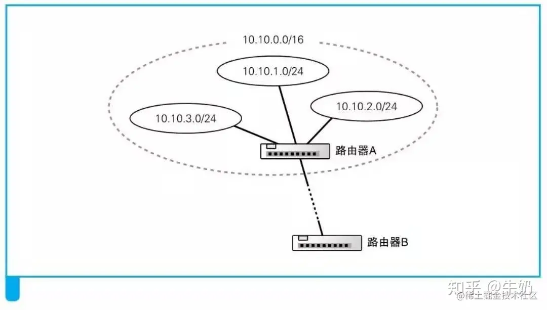 我们现在有3个子网,分别为10.10.1.0/24、10.10.2.0/24、10.10.3.0/24(后面的24表示二进制的前24位是网络号),路由器B需要将包发往这3个子网。在这种情况下,路由器B的路由表中原本应该有对应这3个子网的3条记录,但在这个例子中,无论发往任何一个子网,都是通过路由器A来进行转发,因此我们可以在路由表中将这3个子网合并成10.10.0.0/16,这样也可以正确地进行转发,但我们减少了路由表中的记录数量,这就是路由聚合。经过路由聚合,多个子网会被合并成一个子网,子网掩码会发生变化,同时,目标地址列也会改成聚合后的地址。相对地,也可以将一个子网IP地址拆分成多条记录注册到路由表中。所以路由表中目标地址中的地址,和实际端口外连接的子网或者计算机的网络号可能并不完全相同。